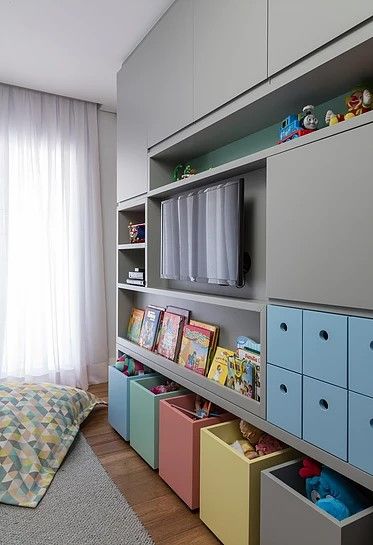 Todo quarto de criança sempre tem uma coisa em comum: bastante brinquedo! E para arrumar tudo isso os organizadores fazem grande parte da decoração, então é sempre bom que eles conversem com o conceito de todo o quarto.